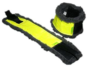 Benreflexer för häst, mjukt teddy foder, gul fluorescerande reflex. Knäpps med stark kardborre samt spänne.