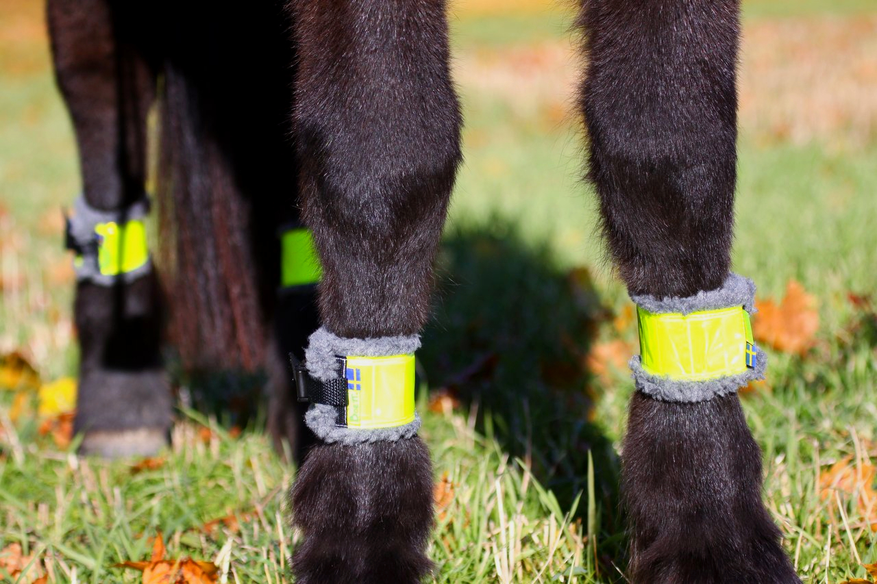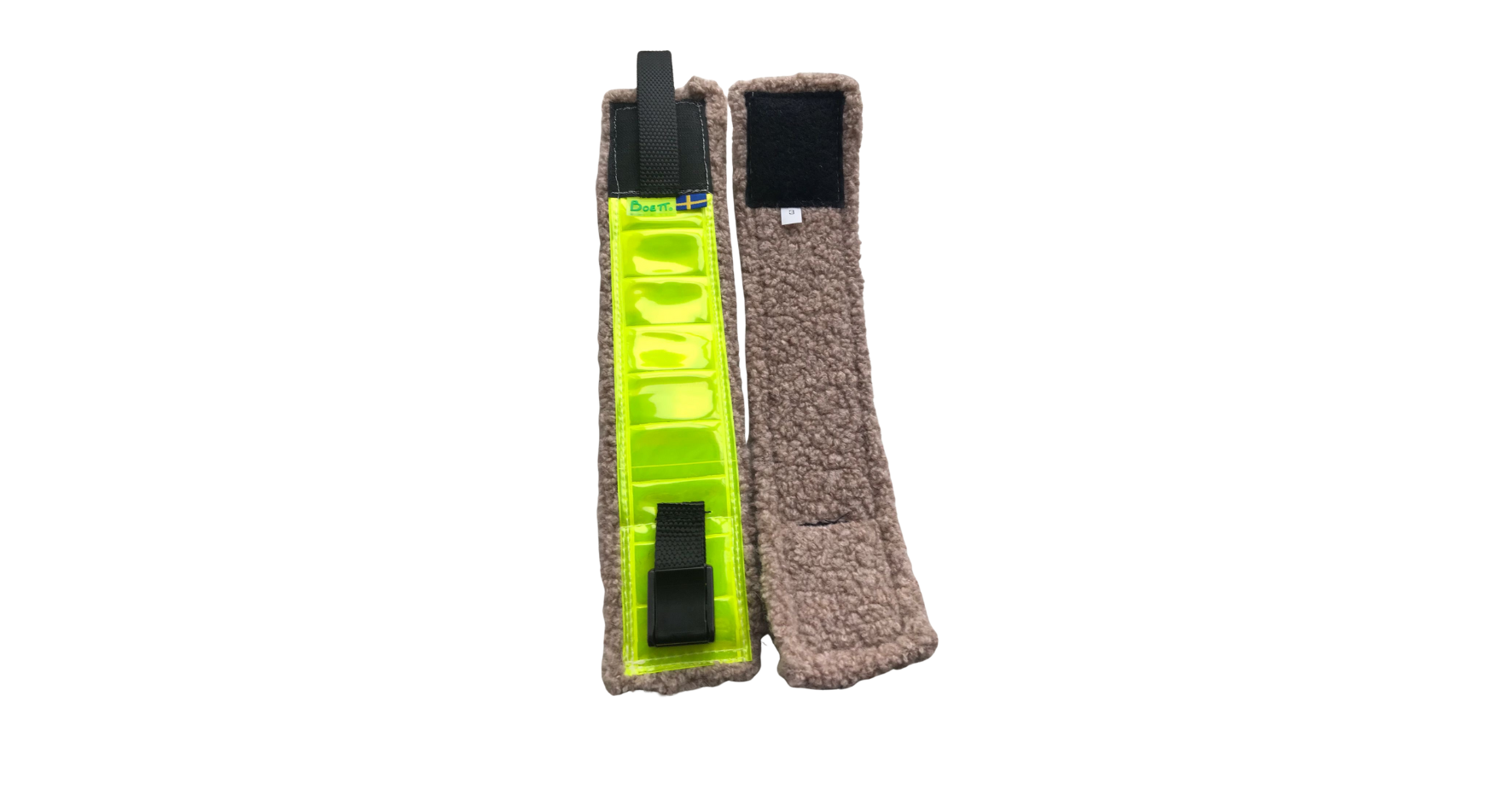 Benreflexer för häst, mjukt teddy foder, gul fluorescerande reflex. Knäpps med stark kardborre samt spänne.
